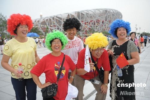 北京奧運(yùn)會(huì)吸引來自眾多國家的運(yùn)動(dòng)員和熱情觀眾的參與,奧林匹克風(fēng)在北京奧林匹克公園激情上演。圖為中國百姓頭戴奧運(yùn)五色帽助興。中新社發(fā) 陳文 攝