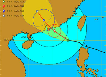 天文臺表示,在正午12時,臺風“鸚鵡”集結在香港的東南偏東約430公里,即在北緯20.3度,東經117.7度附近,預料向西北或西北偏西移動,時速約14公里,大致趨向廣東沿岸。按照現時預測路徑,“鸚鵡”會繼續靠近香港。