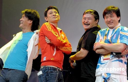 8月22日下午,明星成龍、劉歡、劉德華、周華健亮相北京奧林匹克公園,共同演唱一首《難說再見》。這首動人的歌曲將成為北京奧運跟世界話別的標志性符號。中新社發 陳文 攝