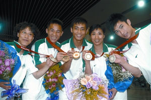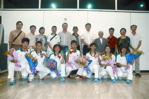 隨著北京奧運(yùn)會(huì)閉幕,同期進(jìn)行的“北京2008武術(shù)比賽”正式結(jié)束,代表澳門參與比賽的7位運(yùn)動(dòng)員及教練團(tuán)成員,帶著世界最高規(guī)格的武術(shù)賽獎(jiǎng)牌,25日晚8時(shí)返抵澳門國際機(jī)場。澳門武術(shù)總會(huì)副理事長李文欽、體育委員尹君樂到場迎接。