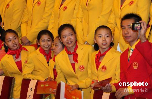 8月26日,2008年北京奧運會中國體育代表團總結大會在北京人民大會堂金色大廳舉行。女子體操運動員參加北京奧運會中國體育代表團總結大會。 中新社發 廖文靜 攝