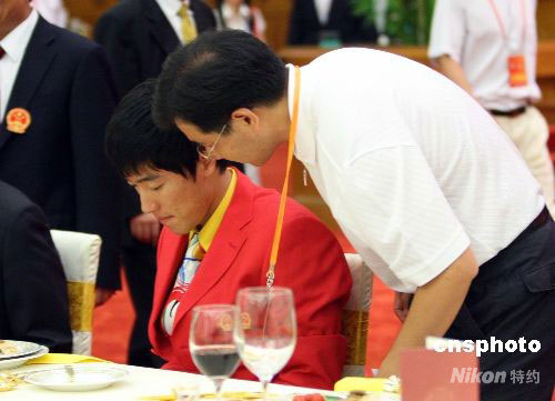 劉翔參加北京奧運中國體育代表團宴會。 中新社發 廖文靜 攝