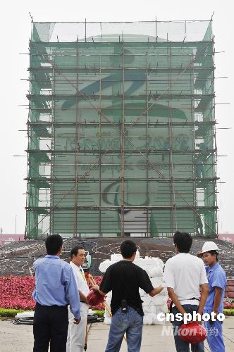 圖:天安門廣場的殘奧會會徽即將揭幕