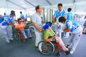 《京華時(shí)報(bào)》記者在距離“鳥巢”相對(duì)較遠(yuǎn)的西側(cè)安檢大棚看到,每一個(gè)安檢大棚門和地面之間,都鋪設(shè)了灰色的地毯,并且地毯呈向下的坡形,讓坐著輪椅的觀眾出入非常輕松。