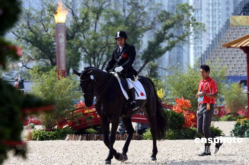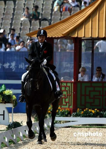 九月八日上午,殘奧會馬術賽在香港沙田賽場進行盛裝舞步團體賽,中國唯一的參賽選手彭裕蓮輕駕坐騎“黑亮亮”出場。中新社發 洪少葵 攝