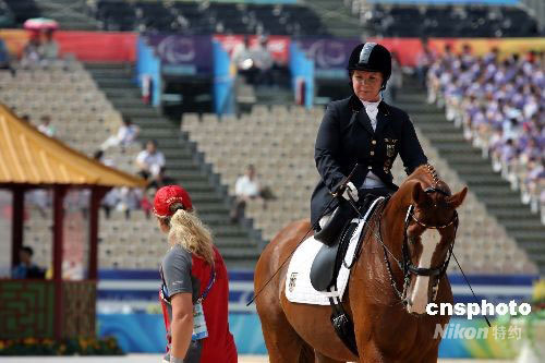 九月八日上午,德國選手安格莉卡·特拉貝特在香港舉行的殘奧會馬術盛裝舞步團體賽上表現出色。本屆殘奧會馬術項目只設有盛裝舞步賽,將產生十一枚金牌,其中包括十枚個人賽金牌及一枚團體賽金牌,獲獎馬匹將獲贈佩花及可裝飾馬房的馬匹銅牌。中新社發 洪少葵 攝