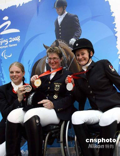 九月八日上午,德國選手布麗塔·納佩爾(中)在香港奪得北京殘奧會馬術比賽個人錦標賽科目級別Ⅱ冠軍,摘取殘奧會馬術比賽首金,加拿大選手勞倫·巴威克(右)獲得銀牌,丹麥選手卡羅琳·尼爾森獲銅牌。中新社發 洪少葵 攝