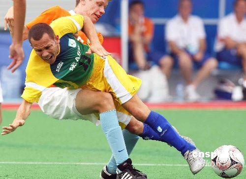 北京殘奧會七人制(男子)足球比賽9月8日在北京奧林匹克公園內的橄欖球場開賽,在一場焦點比賽中,實力強大的巴西隊與荷蘭隊遭遇,最后巴西隊以1比0擊敗荷蘭隊。圖為巴西隊11號若澤·吉馬良斯突破防線后被人高馬大的荷蘭隊5號后衛喬伊·門斯放倒。殘奧會七人制(男子)足球比賽在橄欖球賽場舉行,全場共60分鐘,隊員為腦癱患者。中新社發 任晨鳴 攝