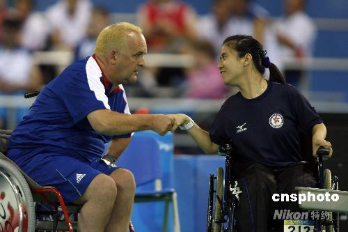 9月9日,中國香港選手郭海瑩在硬地滾球混合單打-BC2決賽中,戰勝英國選手奈杰爾-莫里,為中國香港隊摘得殘奧會首枚金牌。中新社發 杜洋 攝