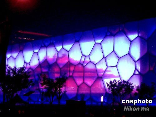 在北京殘奧會(huì)舉辦時(shí)節(jié),國家游泳中心“水立方”的墻面上投影出著名的故宮角樓圖像,更顯示迷人的夢幻色彩。 中新社發(fā) 賈國榮 攝