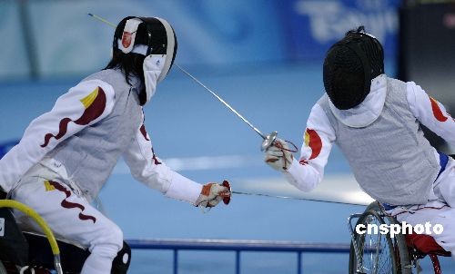 9月14日,北京殘奧會輪椅擊劍在北京國際會議中心擊劍館進入首個比賽日,男子個人花劍A級決賽上演了一場“中國德比戰”,最終3號種子葉如意(右)15-12戰勝隊友6號種子張蕾,奪得金牌。