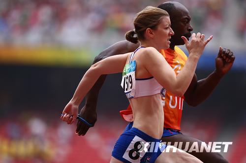 英國選手莉比·克萊格(前)在領跑員的引導下進行女子100米T12級預賽。新華社記者 張燕輝 攝