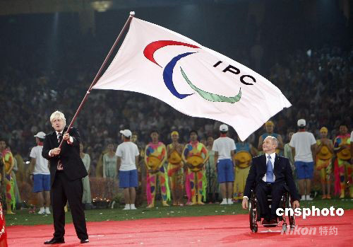 9月17日晚,北京2008年殘奧會(huì)閉幕式在國家體育場舉行。倫敦市長約翰遜在交接旗儀式上,揮舞國際殘奧委會(huì)會(huì)旗。 中新社發(fā) 杜洋 攝