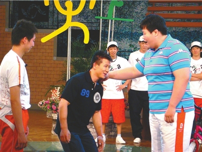 近日,在央視和中國文體明星助威團(tuán)《國慶七天樂,參與奧運(yùn)更快樂》拍攝現(xiàn)場,奧運(yùn)會女子78公斤級柔道冠軍佟文騎著自行車來到了“奧林匹克花園社區(qū)”,剛從車上下來就看到同是奧運(yùn)會體操吊環(huán)冠軍的“老鄉(xiāng)”陳一冰隨便把垃圾一扔,看在眼里的佟文很是不滿,“怎么亂扔垃圾。 辟∥恼f著一個大巴掌把陳一冰給拍趴下了!還是主持人畢福劍考慮周到,把兩人叫到一邊說道:“咱們國慶要七天樂!”(李昊)