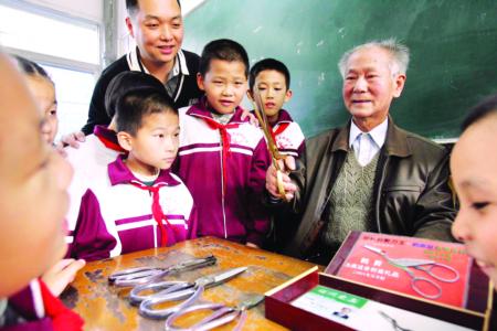 “同學(xué)們會(huì)不會(huì)說福州話啊?”福州電視臺(tái)《攀講》節(jié)目主持人“土豆”發(fā)問了。“我會(huì)!我會(huì)!”孩子們的情緒馬上高漲了起來,紛紛舉手,表示自己是個(gè)小小福州人。“誰知道我們福州的傳統(tǒng)手工藝有哪些?今天,我們給大家介紹三位傳統(tǒng)手工藝的傳人,首先是剪刀狀元!”在孩子們的掌聲中,“鄭興利”剪刀的第三代傳人鄭德官走上講臺(tái),八十高齡的他首先拿起一把剪刀,為孩子們講起有關(guān)“福剪”的往事。同學(xué)們被新奇的故事吸引了。鄭老又拿出幾把自己生產(chǎn)的特色剪刀,有的剪刀頭鑄成圓弧狀防止傷人,有的剪刀小巧可愛,有一把剪刀做成了一只仙鶴的形狀。