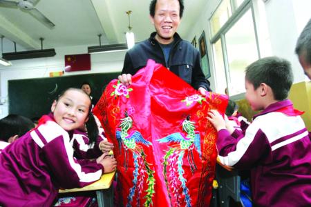 看著穿著統(tǒng)一校服的同學(xué)們,福州刺繡傳人張三忠說:“如果是在過去,七八歲孩子的衣服上會有好多花樣,花紋圖案都是繡上去的。”說著,他拿出一幅繡品,一件繡著金線鳳凰的紅色綢緞,同學(xué)們都說太好看了,都想用小手摸一摸,張先生爽快地答應(yīng)了。孩子們一個(gè)個(gè)走過去,用手觸摸有上千年歷史的福州刺繡。張先生說,此時(shí)他想到,“未來”正在感知“歷史”。