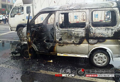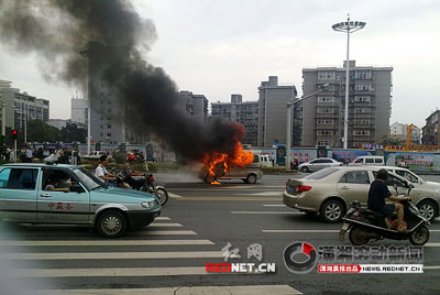 29日上午11時,一輛白色小貨車行至株洲市紅旗廣場南口時突然自燃。蘇勇 付冬冬 邵驍歆攝(圖片來源:紅網)