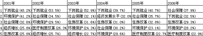 表:2001年~2006年城市居民關(guān)注的國內(nèi)社會熱點問題(前5位)