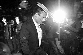 林肯車停下后,先是戴著面具的美女們從白色林肯車內鉆出,鎂光燈、閃光燈鋪天蓋地地“罩”下來,她們低著頭一一走過“星光大道”,一位美女踩著高跟鞋的步伐有些不穩。相較美女從容的表現,富豪們則要羞澀得多,幾乎過半的富豪都利用某網站分發的包裝袋,或頂在頭上,或用來掩面,“溜”也似的小跑入內。
