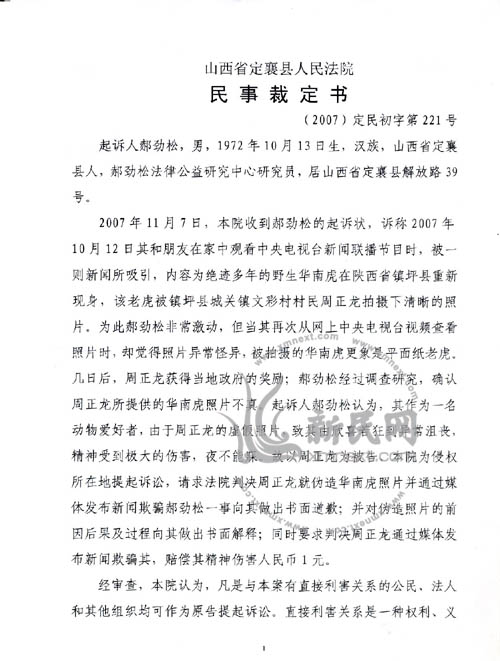 據媒體報道,郝勁松于11月7日正式向山西省定襄縣人民法院起訴“華南虎”拍攝者周正龍,按照民事訴訟法相關規定,在法定期限內,郝勁松沒有收到任何通知。11月28日,新民網連線郝勁松,他稱11月27日終于見到了定襄縣人民法院的民事裁定書,法院對郝勁松的起訴不予受理。郝勁松向新民網表示,他將在法定期限內向山西省忻州市中級人民法院提出上訴。