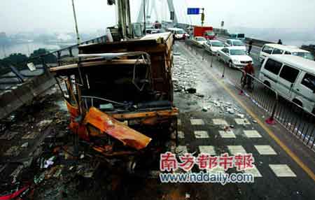 泥頭車再惹是非!昨日清晨6時許,一輛滿載水泥磚的泥頭車在廣州荔灣區鶴洞大橋橋面北往南爬坡行駛時,突然失控撞倒護欄,一頭撞向迎面駛來的一輛中巴,差點將中巴撞下20多米高的橋。中巴上的30名司乘人員受傷,其中4人重傷。