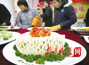 走進(jìn)展廳,記者就被展臺(tái)上的菜肴所吸引。在比“雕工”的展區(qū),南瓜、蘿卜、山芋等普通蔬菜被廚師們用妙手雕刻成龍、鳳、仙子等各色造型,刻工精細(xì),龍須、鳳尾上的羽毛,甚至是一根根的。已有10年廚齡的宋師傅告訴記者,作品里除了南瓜、還有紅、青蘿卜、山芋等食材,一共刻了三個(gè)小時(shí)才完工。在比“擺盤(pán)”的展區(qū),不少菜肴都是以?shī)W運(yùn)為主題,用面條搭建的“鳥(niǎo)巢”體育場(chǎng),形象逼真。用白色白玉糕、綠色麥香糕、糯米元宵擺出的五環(huán)體育場(chǎng)惟妙惟肖,“操場(chǎng)”外五位用糯米做的福娃更是可愛(ài)喜人,據(jù)介紹,從蒸糕點(diǎn)到擺盤(pán),廚師一共花了九小時(shí)呢,香噴噴的米糕看著都眼饞。