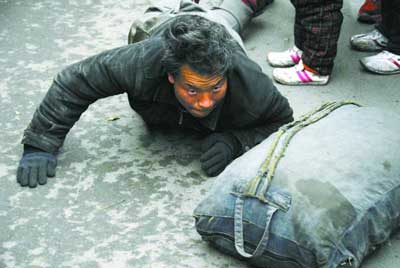 3時30分許,記者趕到東三馬路。一穿著灰色上衣、黑色褲子的男子雙膝跪地,雙手撐在地上,兩手一前一后地向東緩慢爬行。他身前放著一碩大的淺藍色帆布包裹,每爬一步他都先用手把帆布包往前推去。男子約40歲,凌亂的頭發(fā)中夾雜不少白發(fā),從頭到腳均是臟兮兮的。