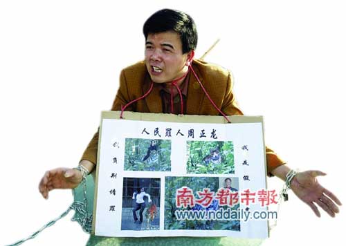 “以前我在老家放牛,現(xiàn)在出來打老虎!”他胸前掛大紙牌,手戴鎖鏈,背負枝條盤腿而坐。昨天,一男子在深圳市民中心廣場面向國旗坐著稱,陜西華南虎事件有辱國家形象,他身為一個有良知的公民,要替拍照者周正龍“負荊請罪”,直到虎照第二次真?zhèn)舞b定出來為止。