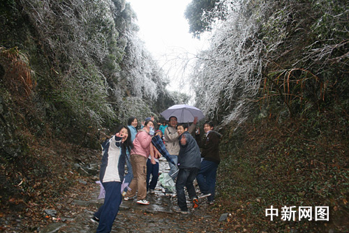在遠近聞名的梅關古道兩側,目光所及都是一片銀枝玉葉、冰掛霧凇,樹上早已綻放的千姿百態、婀娜多姿的白梅、臘梅、綠梅與晶瑩的冰雪花交輝相映,讓人眼花繚亂。在“嶺南第一關”門樓前,一群群年輕人絲毫不懼嚴寒,或相爭取景拍照留影,或盡情玩耍放聲大喊。“真是意外的驚喜,沒想到這次到南雄來休閑正好遇上了這場雪。古道踏雪賞梅還是第一次”一群從廣州來的游客興奮不已地告訴記者。