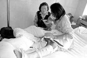 黃慶南遇襲后,母親特意從老家趕來照顧他。他的左腿筋骨、血管、肌腱與神經全被砍斷,至今未能痊愈。記者 徐春柳 攝