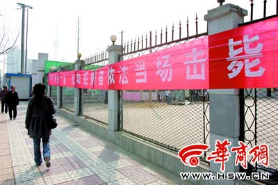 昨日上午10時30分許,記者來到丈八路與朱雀大街路口,遠遠就看到路口的西南角,陜西扶貧技術學院南校區圍墻外,掛著紅底白字的醒目橫幅。上面的內容是“嚴打‘兩搶一盜’搶劫拒捕者依法當場擊斃”。落款是“長延堡派出所”。