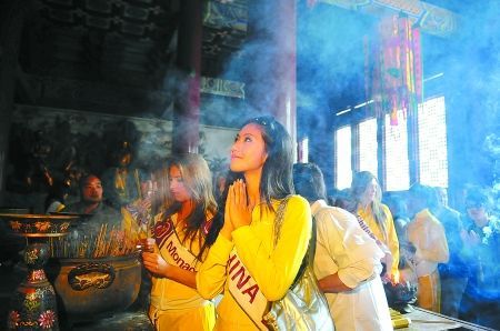 中國旅姐童鶴燒香祈盼能取得好的名次