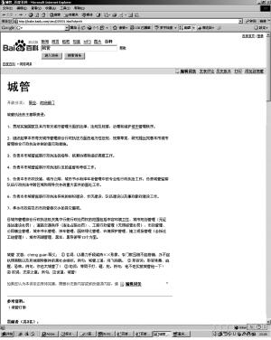 據(jù)了解,“百度百科”自稱是一部由網(wǎng)友共同撰寫的百科全書。網(wǎng)友要想讓自己的詞條被收錄,必須得到百度管理員的批準,如果含有色情、暴力、恐怖、不文明內(nèi)容的詞條,將不能成功上傳或遭刪除。惡搞“城管”一詞的釋義,就是4月3日由網(wǎng)友上傳上去的。