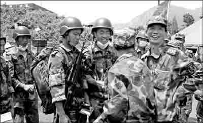 “我們來唱支軍歌吧。”2008年5月18日11時30分,空降兵某軍指揮官戴志強站在已成孤島的綿竹市三江村,對前方奔騰而來的巨石大喊時,56名災民已乘坐直升機安然離去。