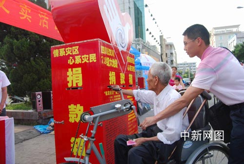 愛心圣火的第二個片段,發生在溫州蒼南。五月十八日是第十八個“全國助殘日”,蒼南縣的四百多名殘疾人匯集在蒼南雙臺街路口的募捐點,為抗震救災盡上一份綿薄之力。在不遠處的靈溪影城廣場,一個高兩米四、寬一米二的捐款箱赫然醒目,張貼著四川地震救災現場照片的多幅畫板一溜排開,身著帶有愛心標志統一服裝的志愿者們不停地向過往的行人分發聯合倡議書。