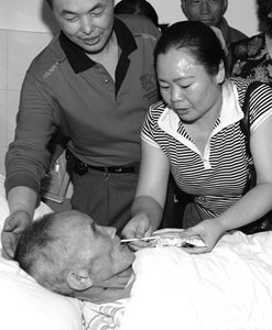 送到醫院后,老人已陷入昏迷,十多名醫護人員立即將老人推進病房急救。3名護士更是守在病床旁連續呼喊“爺爺,爺爺!”,以對其模糊的意識進行刺激。用藥2小時后,老人奇跡般蘇醒過來。不料老人卻對著醫護人員大聲呼喊“我沒有病,我要離開,你們滾!”張貴清趕緊上前握住爺爺的手,“爺爺,我在這里呢?”見到孫子在,老人才平靜下來!盃敔敾加欣夏臧V呆,他只認得到我,所以見到醫護人員才會破口大罵。我感到很不好意思,熱情的重慶醫護人員受委屈了!”昨天,張貴清面對醫護人員深深鞠躬以表謝意和歉意。(記者 陳宇)