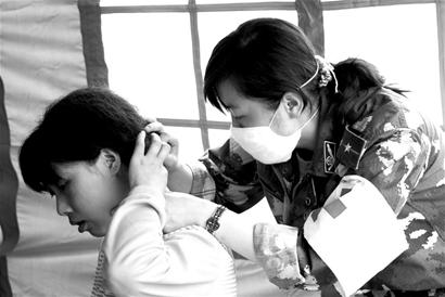 5月12日的晚上,尹萍幫同事們搭好帳篷后,發現自己沒有帳篷了,她只能回到了三樓膽顫心驚地睡覺。半夜,余震將她晃醒,她撥通了愛人的電話,只說了一句話:“老公,我害怕……”就再也忍不住淚水決堤。由于愛人在蘭州,自己的家在銀川,他們一年最多只有一個月的時間在一起。說到這里,尹萍的眼眶又濕潤了,她背起了消毒水,擠出了一個微笑:“我去給戰士們消毒了。”(李澤江 記者江瑋實習生楊冬攝影報道)