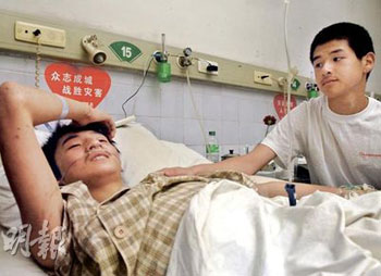 不過,醫院工作人員表示,廖波的傷口有感染征狀,可能需要再動手術,他也經常做噩夢而驚醒,一次次回到地震當天的情景,想起遇難的同學就會流淚。見此情況,李陽想多陪廖波幾天,在醫院亦有北川中學的老師,答應照顧李陽的衣食住行,并會在他復課前帶他返校。