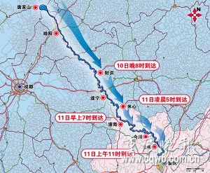 唐家山堰塞湖下瀉的洪水正向重慶奔來,預計今日凌晨5時進入(重慶)潼南米心鎮(zhèn),今上午11時到達北碚。