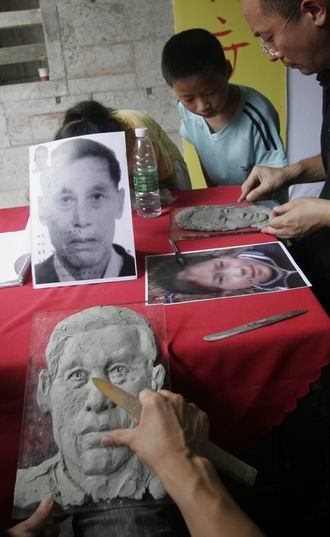 在展場內,雕塑家們開始現場創作浮雕頭像。每位雕塑家的手邊都有一張真人大小的遇難者失蹤者的正面肖像照,上面還打印著主人的姓名、籍貫、出生日期、死亡日期。雕塑家們將雕塑專用泥土細心地抹在照片上,然后用雙手捏塑出一個和照片大小完全一樣的浮雕塑像,其后還要經過多項工序加工。據譚云介紹,經過精密計算,每塊銅板真人浮雕頭像的制作成本將控制在600元以內,全部完成預計將用兩到三年的時間。(華西都市報 記者陶玲 胡曉 攝影朱建國)