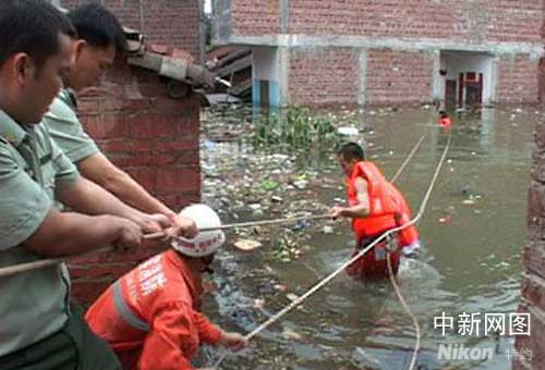 消防支隊立即調派人員趕赴現場營救,F場附近許多瓦房都已被泡在水里,只露出屋檐,一些來不及處理的垃圾和木棍橫七豎八地浮在水面上。據附近的村民介紹,這里一帶的水位有三至五米深,中間還有一條較寬的水溝,而被洪水圍困的人員就在岸對面約50米遠的一棟三層樓高的民房內,已經有四天時間了。