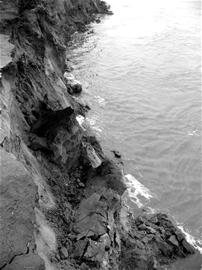 昨日(6月19日)上午,記者在長江黃州赤壁外灘看到,坍塌段江堤仍陸續有一些大塊土方不斷掉入江水中,長達2000米的江岸出現塌陷,最大塌陷寬度達8米,李家洲林場在岸邊栽種的防洪林,已有不少崩入江水中。