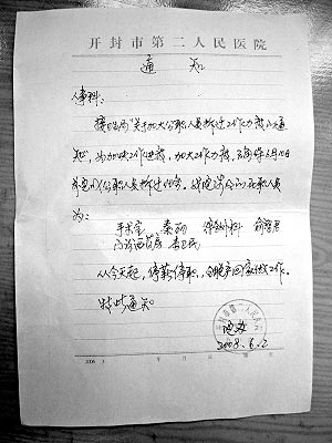與周丹一起被停職的還有她的兩名同事。在開封市第二人民醫院對這三人的停職通知上,寫明是“按市衛生局下發‘關于加大公職人員拆遷力度的通知’”。開封市衛生局5月30日下發的這個通知要求,從自6月2日起,各單位涉及拆遷的公職人員一律停薪停職,全部脫產回家做工作。