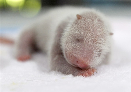 據張志和介紹,“奇緣”的這次產仔經歷,“可謂艱難”。當包裹著一層胎膜的第一只幼仔被“奇緣”順利娩出后,已經有過生育經歷的“奇緣”立刻將幼仔叼了起來,擁在懷里,用舌頭舔舐著幼仔身上的胎膜。隨著時間一分一秒地過去,“奇緣”已經顯出了倦態,可懷里的幼仔依然被胎膜包裹著。一直在旁注視著“奇緣”一舉一動的專家都緊張了起來,胎膜不去,這只幼仔就可能有生命危險。看著幼仔粉色的頭部慢慢轉為烏青色,科技人員立即決定,將幼仔從母親“奇緣”懷里取出來,采取人工輔助的方式剝掉它的胎膜。冒著可能被“奇緣”抓傷的危險,基地專家巧妙地引開了“奇緣”的注意力,快速地把幼仔取了出來。當這個小生靈被搶出來后,基地專家發現,它已經因胎膜包裹的時間太長而出現了頭部發烏,缺氧窒息的危險狀況。專家們馬上開始對奄奄一息的幼仔進行人工心臟按摩,讓它吸上氧氣。慢慢地,幼仔的頭又恢復了初生時的粉色,順利成活。