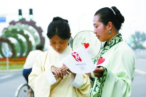 她的同伴,北京聯合大學大二的學生吳佳嫻,手上印有北京奧運的徽章,漢服上貼有心形國旗圖樣。她和豐茂華是“漢網”(漢服愛好者交流的網站)的網友。二人穿著的漢服是到專門服裝店訂做的。