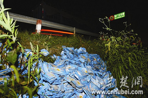 昨晚9時許,記者趕到現(xiàn)場看到,京廣立交橋離孝感主城區(qū)約1公里左右,是107國道與京廣線的交會處,奶粉袋位于107國道橋頭的雜草叢中,每5個空袋用橡皮筋捆為一扎。記者隨手翻開了兩扎,發(fā)現(xiàn)奶粉袋上灰塵不多,袋口均有撕開的痕跡,上面標注的生產(chǎn)日期從2006年3月到9月不等,保質期為18個月。