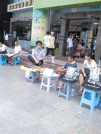 13日下午2點,記者來到南坪西路看到,在西計大廈門口有幾個收售二手手機的小販坐在那里,都在劃定的區域內擺攤。西計大廈門口有一名身穿城管制服的隊員一直來回巡邏,當有小販將收售手機的紙牌亮出來的時候,城管立即上前要求他收起來,并且附近大概每兩百米就有一名城管在來回巡邏。