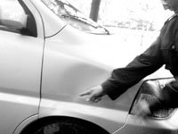 昨日15時40分,記者來到位于正義路市公安局對面的輔路上,只見一名30來歲的青年男子倚在警車旁邊,大半個身子倒在地上意識迷湖,民警正在一旁詢問情況。警車的身后停著三輛有城管標志的車,其中一輛金杯車的前蓋右側處有一個坑,表層的鐵皮明顯凹陷 (見圖),車身上寫著“崇文綜合執法”,還有一輛車的車斗上有一輛舊三輪車,城管工作人員稱,該三輪車是被暫扣的非法無照運營車輛。