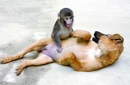昨天(5日)上午,記者在駐馬店市南海公園動物園看到,一只6個月大的雌性小狗與年齡比自己小一個月的雄性猴崽愉快地在一起玩耍。