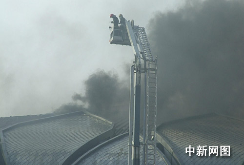 圖為濃煙滾滾的濟南奧體中心在建室內項目比賽體育場館頂部。 楊東亮 攝